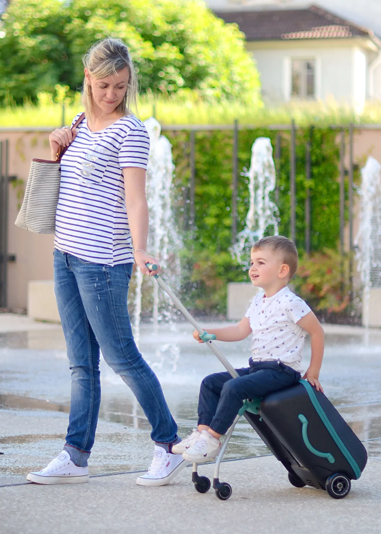 - Pratique : Deux Roues Supplementaires Rendent La Valise Stable Pour Faire Glisser Votre Enfant (Jusqu’A 50Kg) Ou S’Assoir Pour Patienter (Jusqu’A 100 Kg)