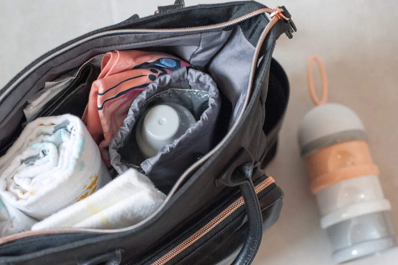 - Grande Poche Fermee A L’Avant, 2 Poches Ouvertes Sur Les Cotes Pour Mettre Des Biberons, 1 Grande Et 2 Petites Poches Interieures Elastiques
